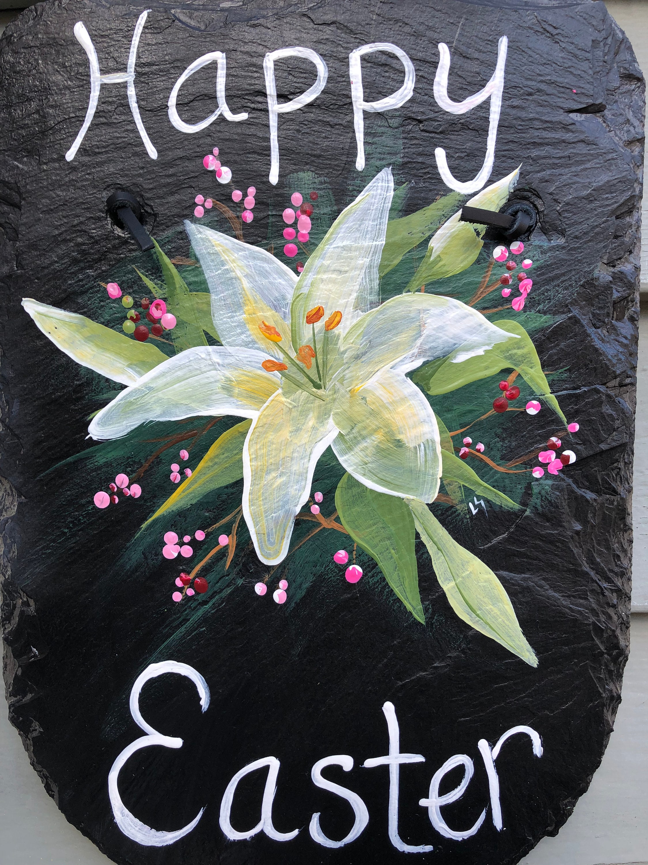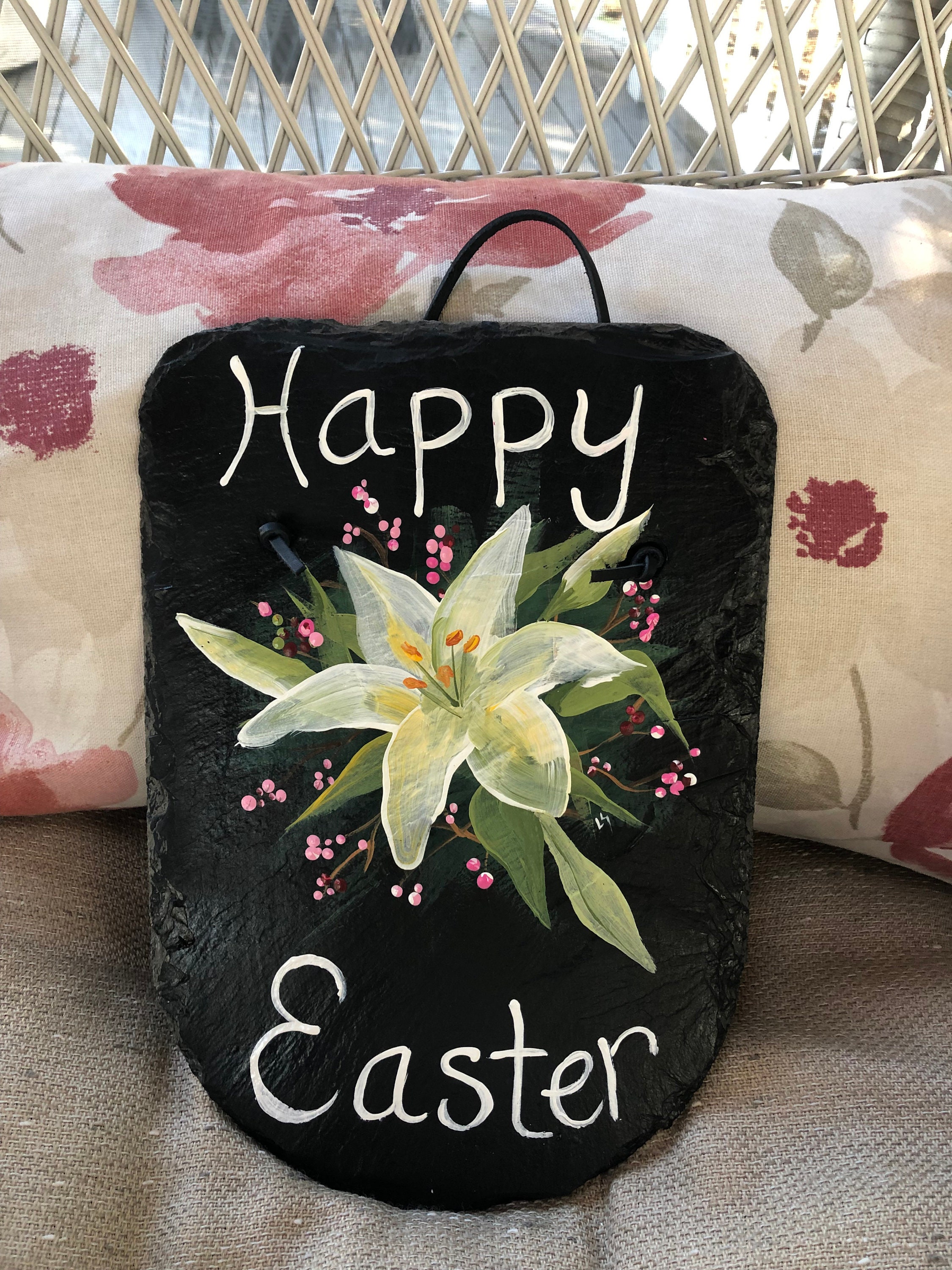 Beautiful painted slate with Lillies - personalized "Easter Blessings". Matched description. Shipped quickly and packaged well - no damage in shipping.