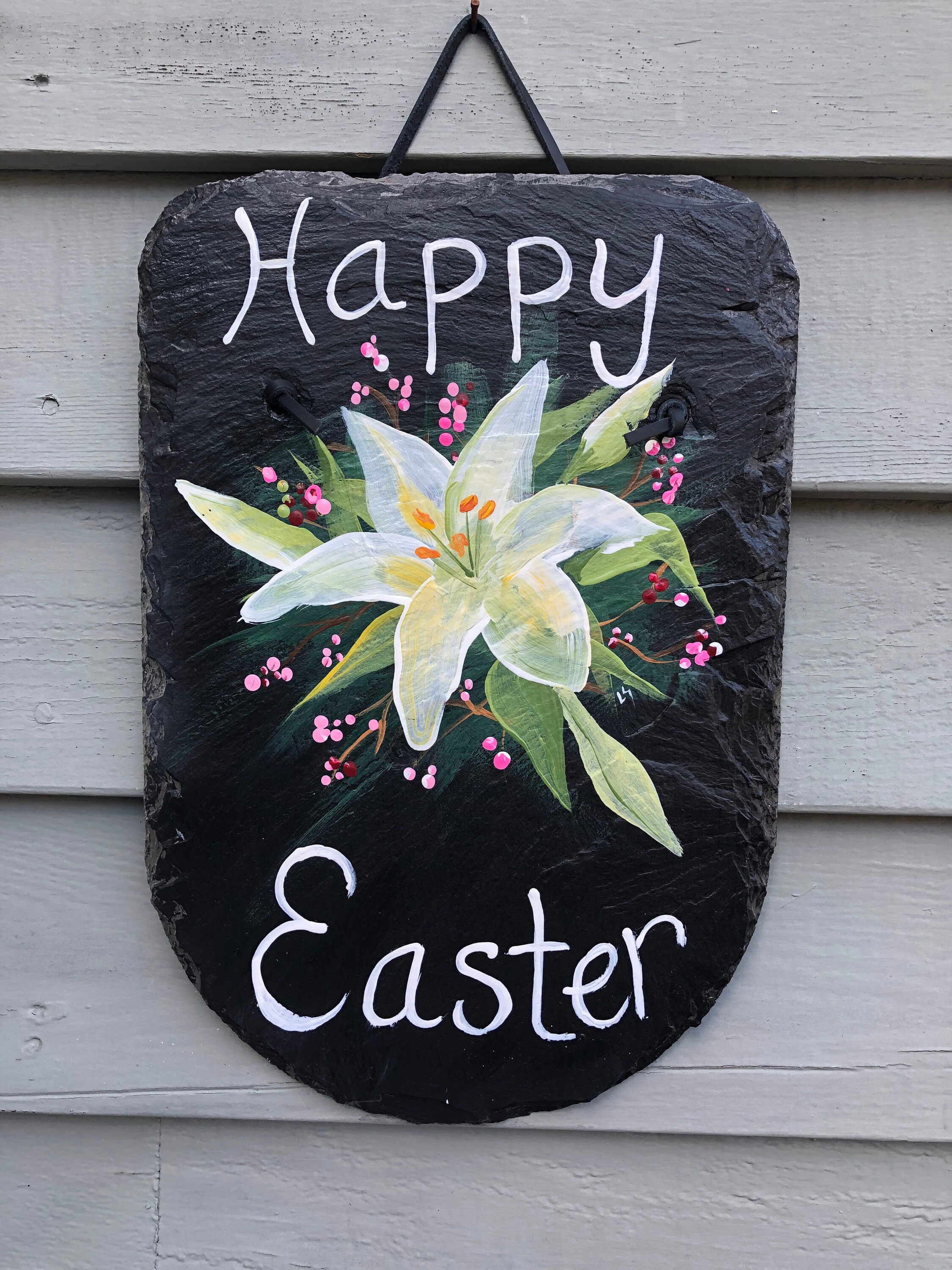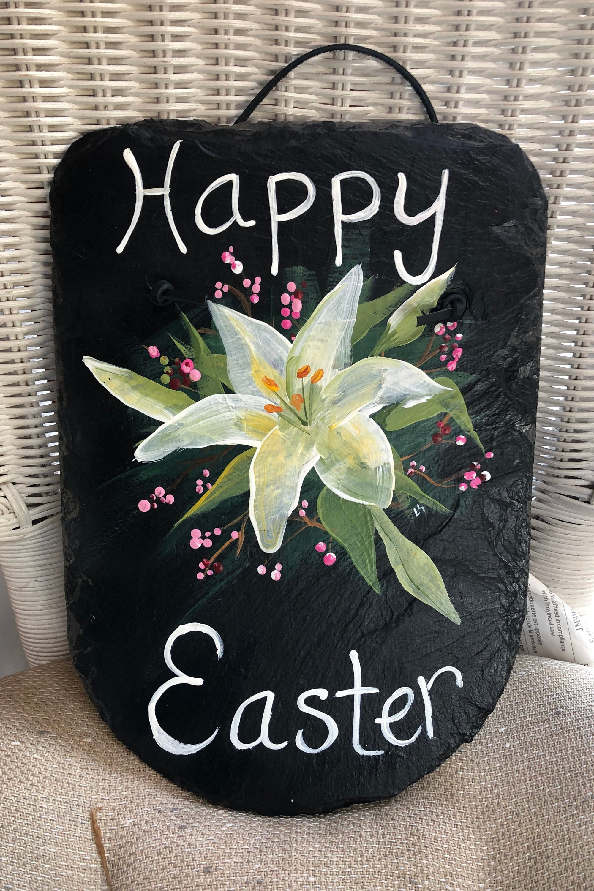 Happy Easter Painted slate, Easter door hanger, Porch Decor, Easter decor, Easter decoration, Easter Lily, Easter, Spring door hanger