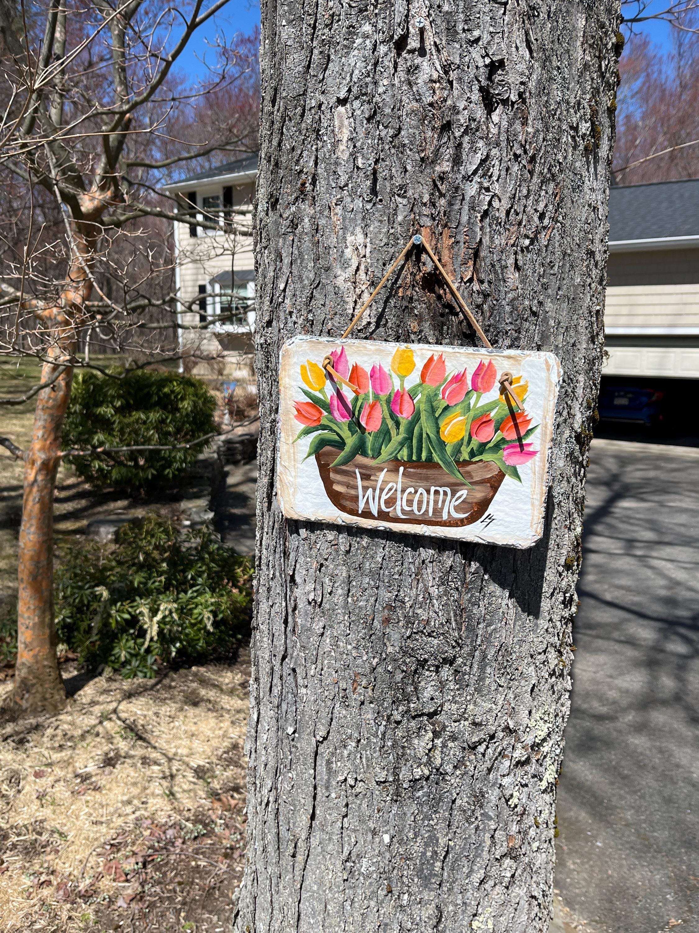Painted slate welcome sign, 7 x 10 slate sign, welcome plaque, Porch decor, door hanger, welcome sign for apartment, small slate sign
