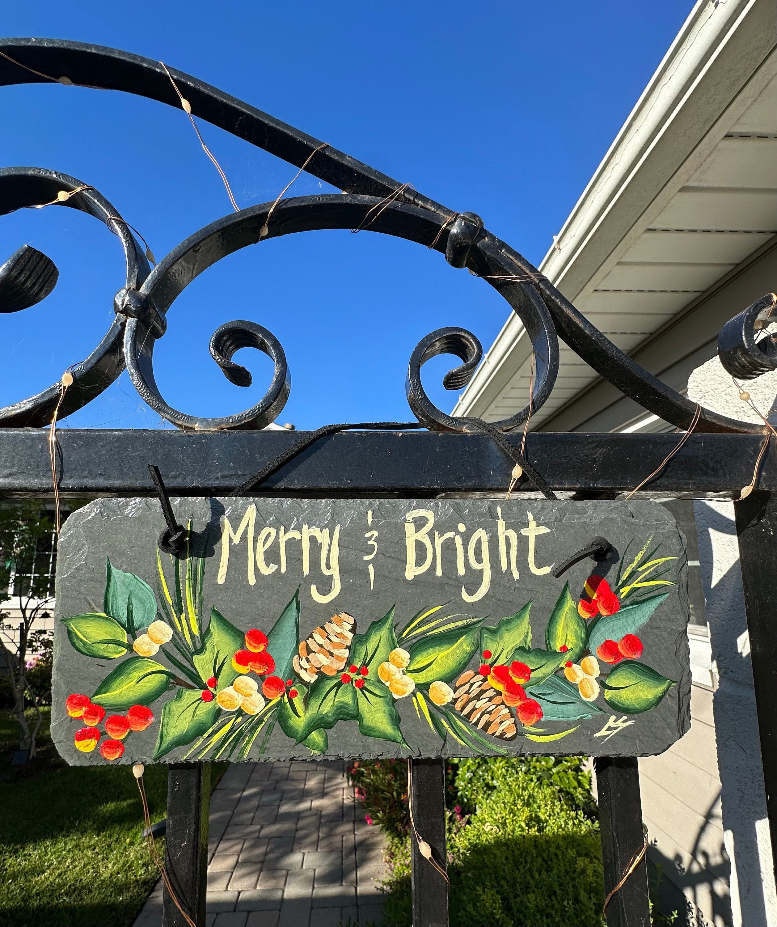 Painted winter greens welcome sign, Porch decor, painted slate sign, Winter sign, Winter door hanger, black & white check winter slate sign