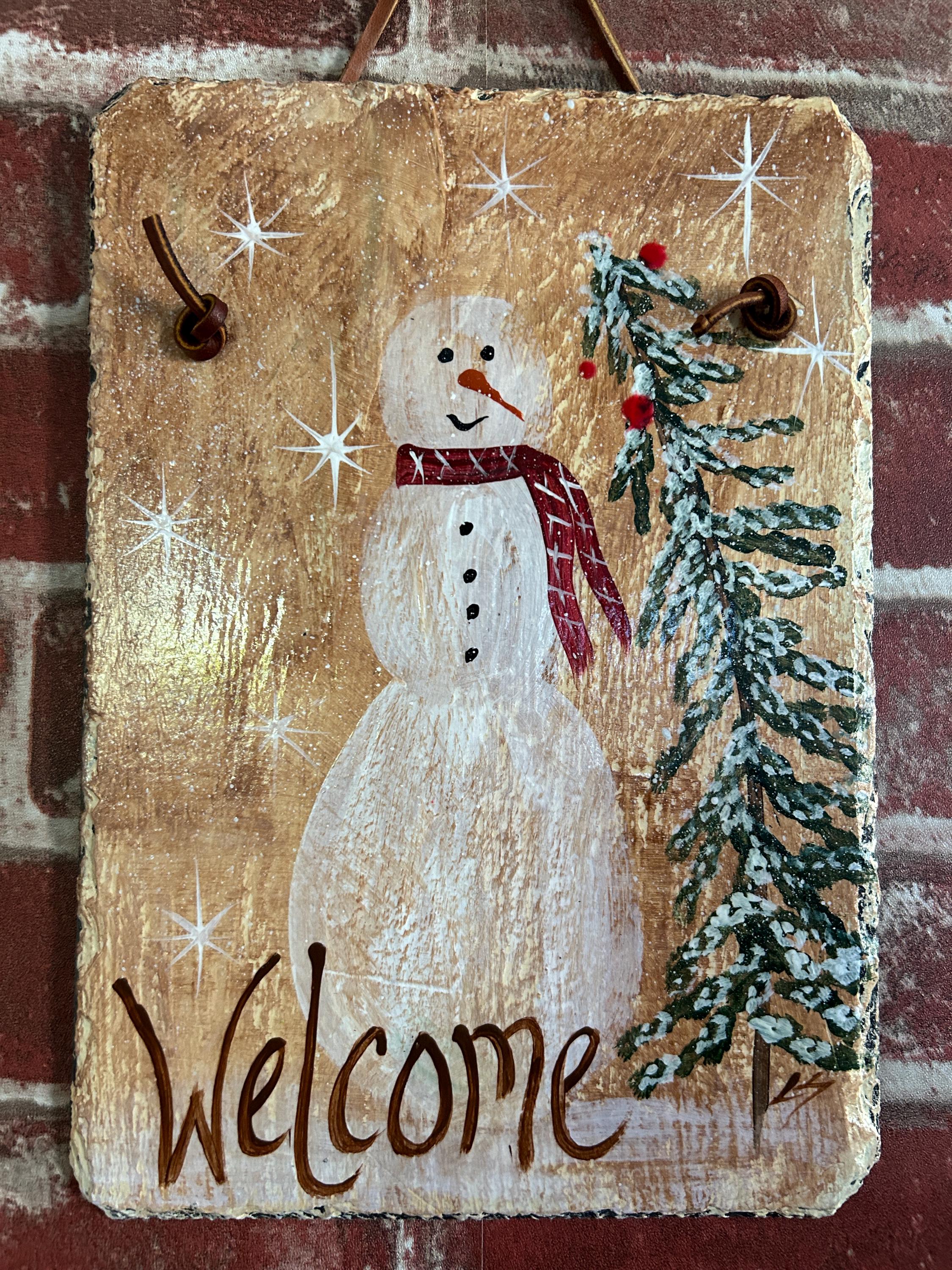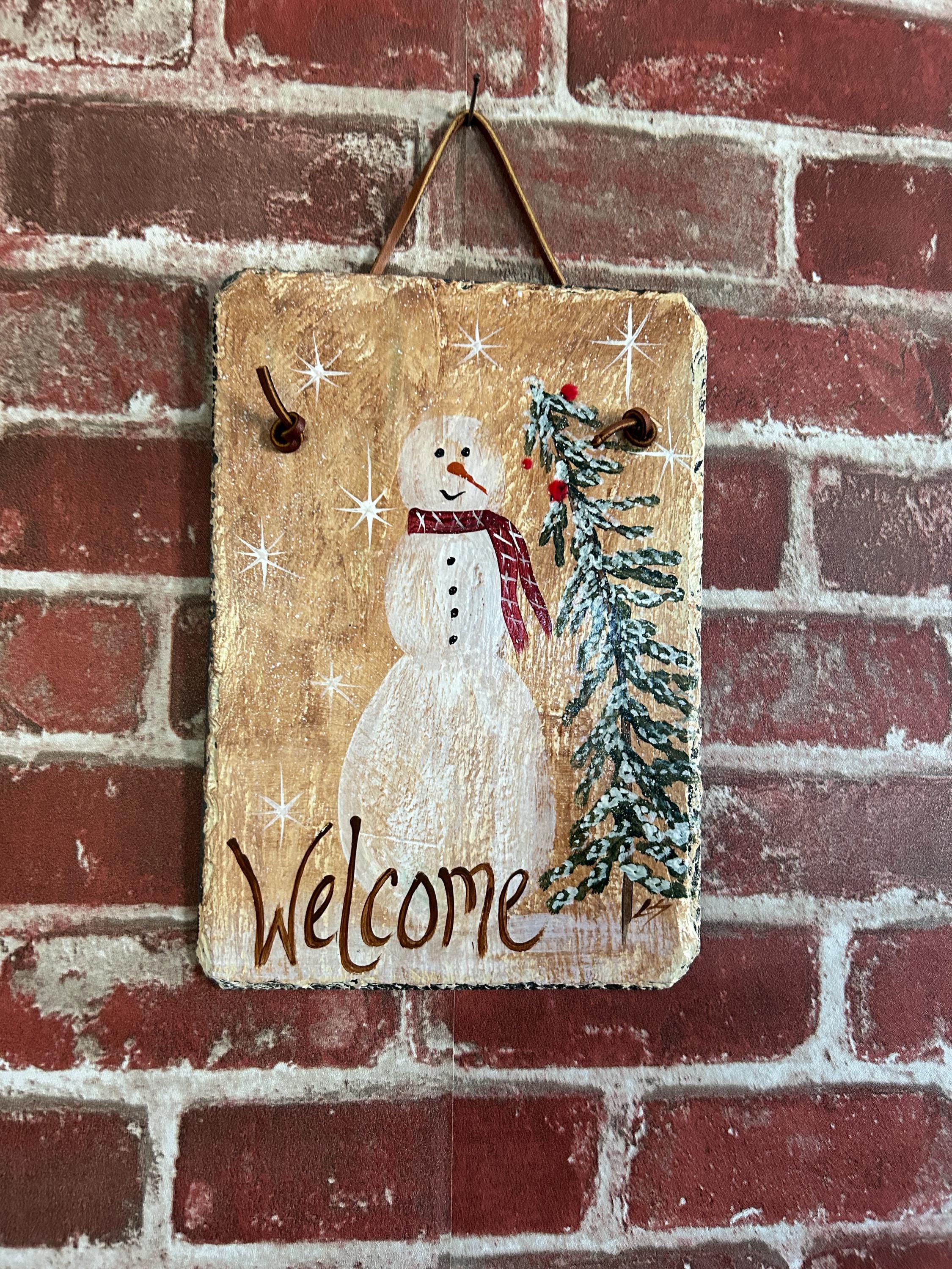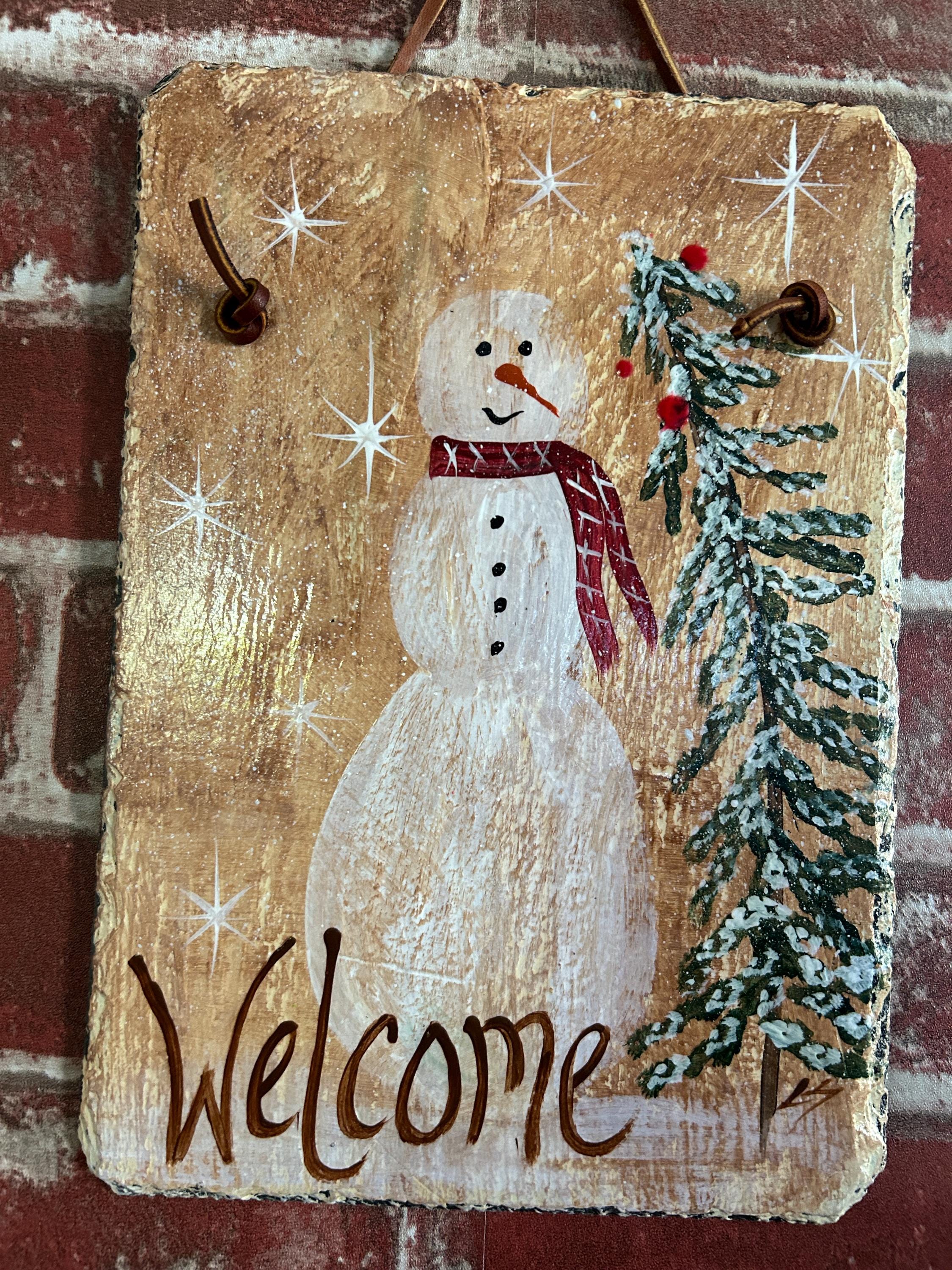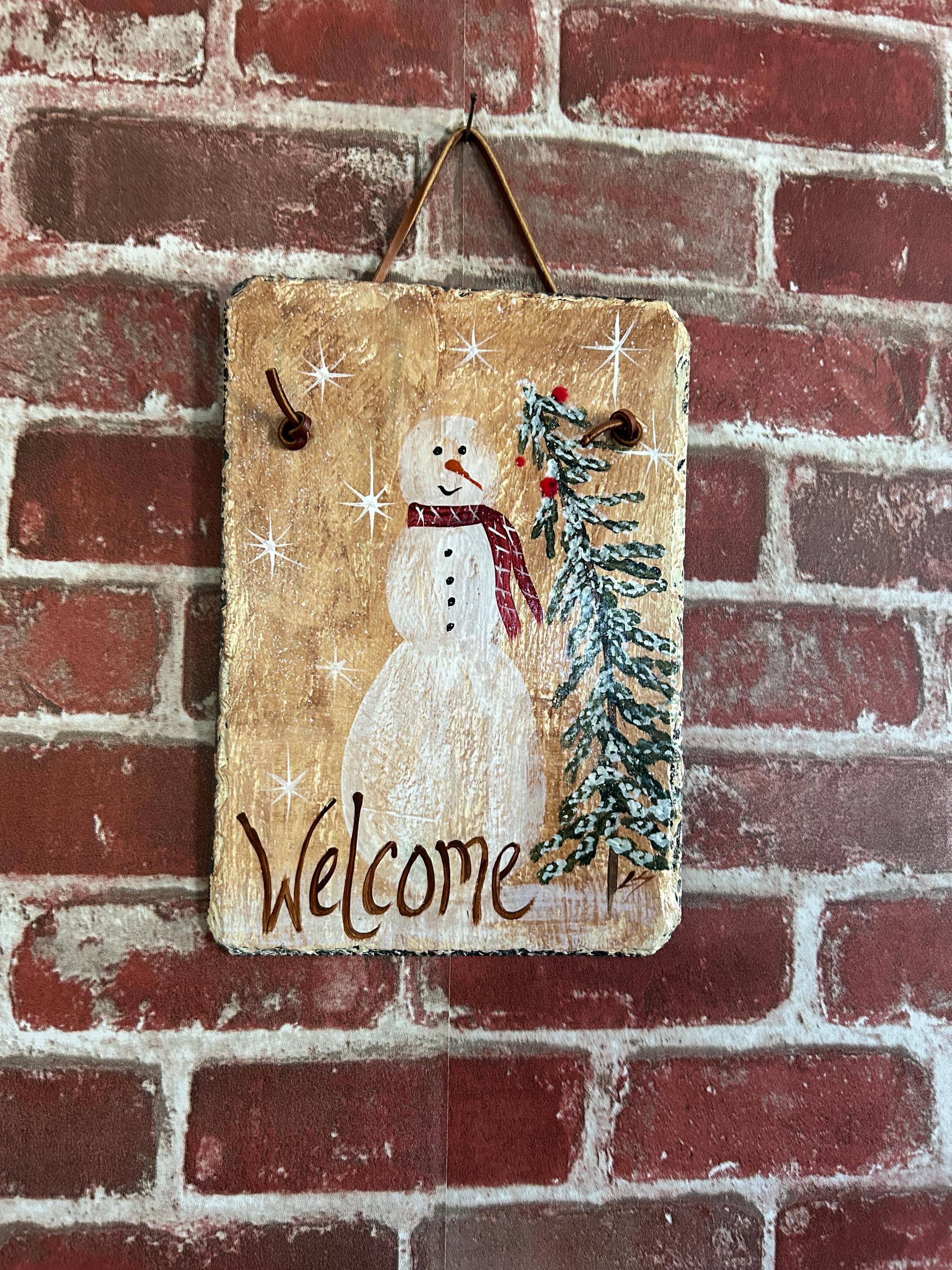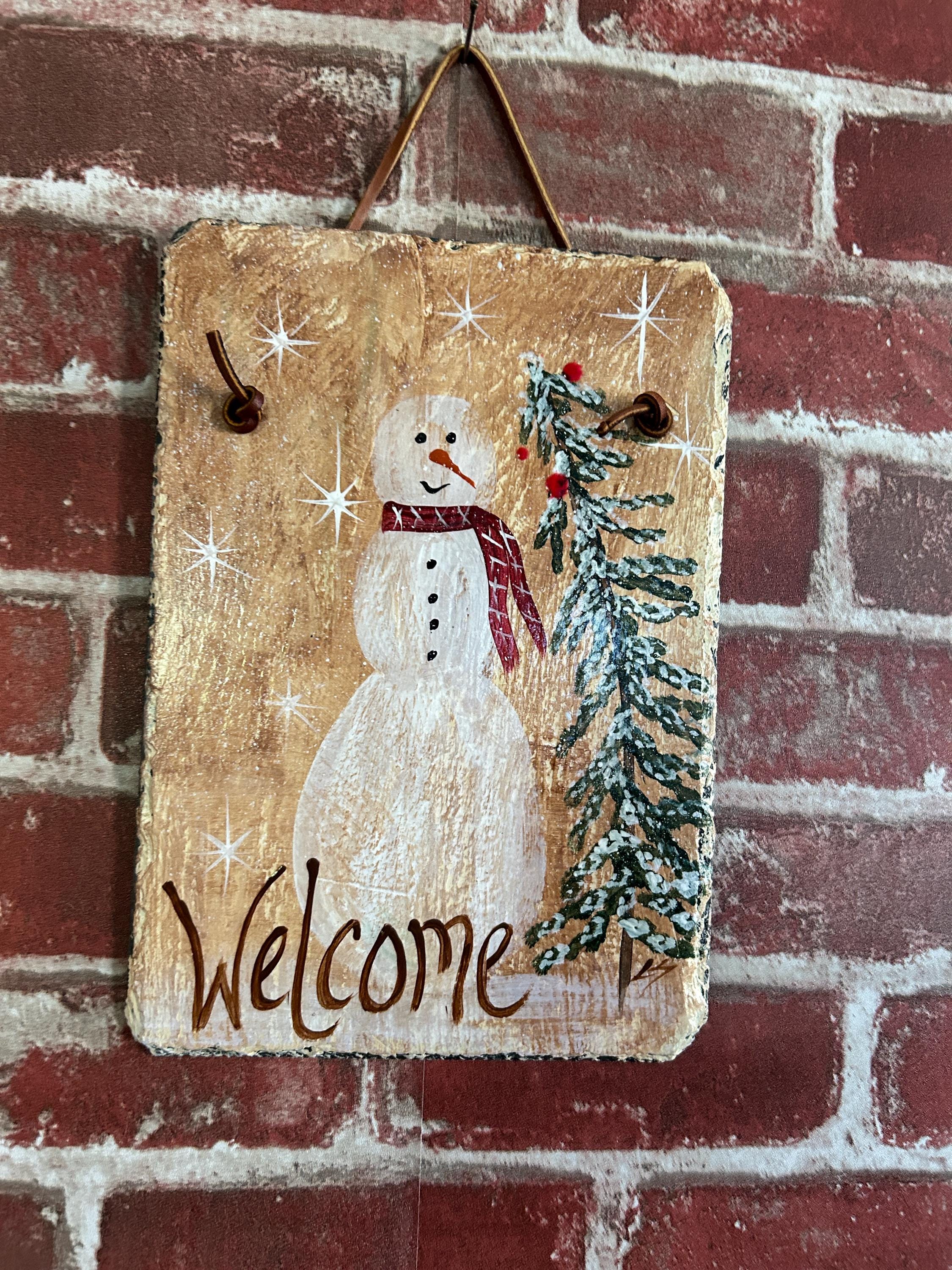 Painted winter Snowman welcome sign, Porch decor, painted slate sign, Winter sign, door hanger, Snowman slate sign, Snowman art,