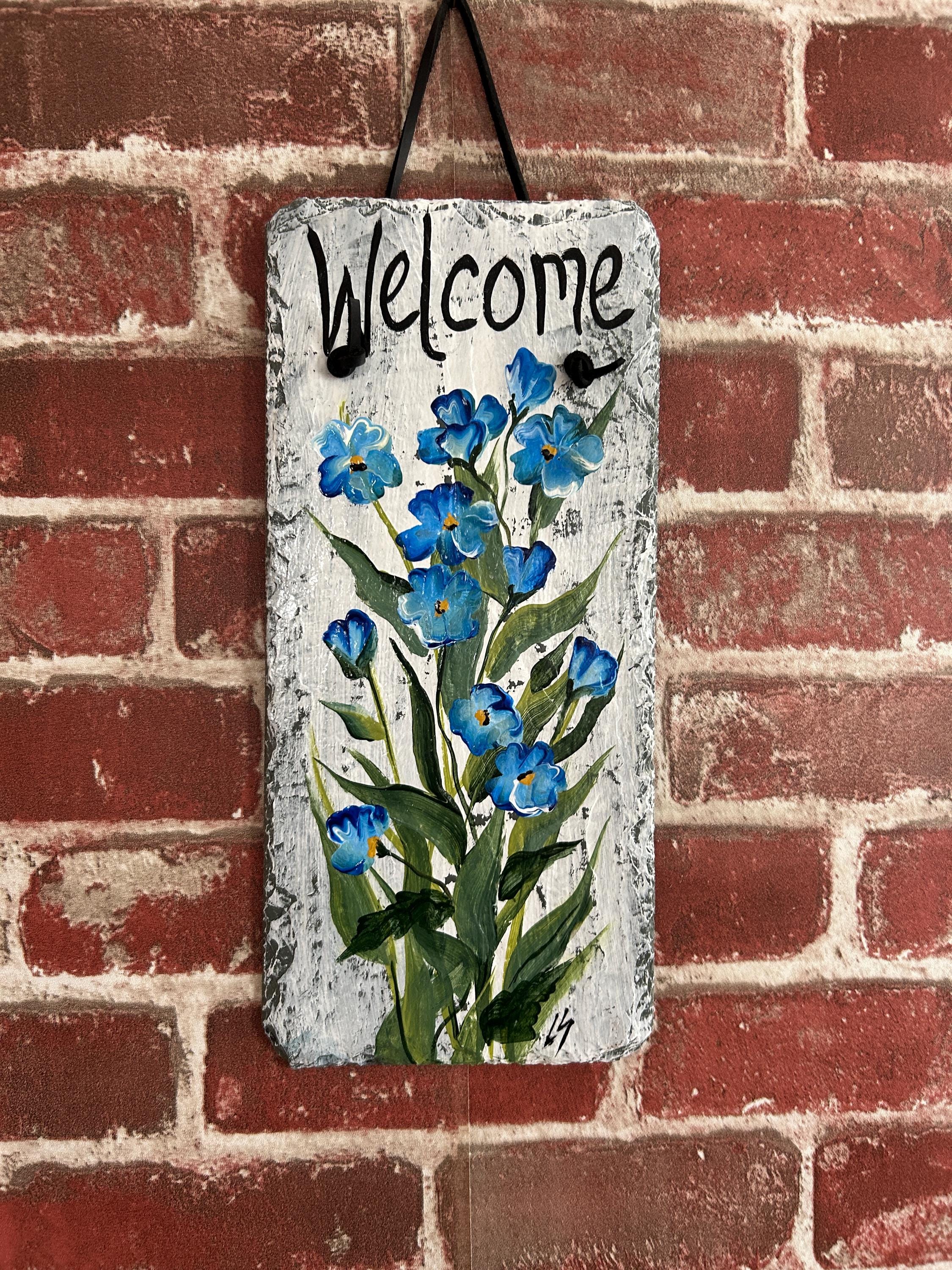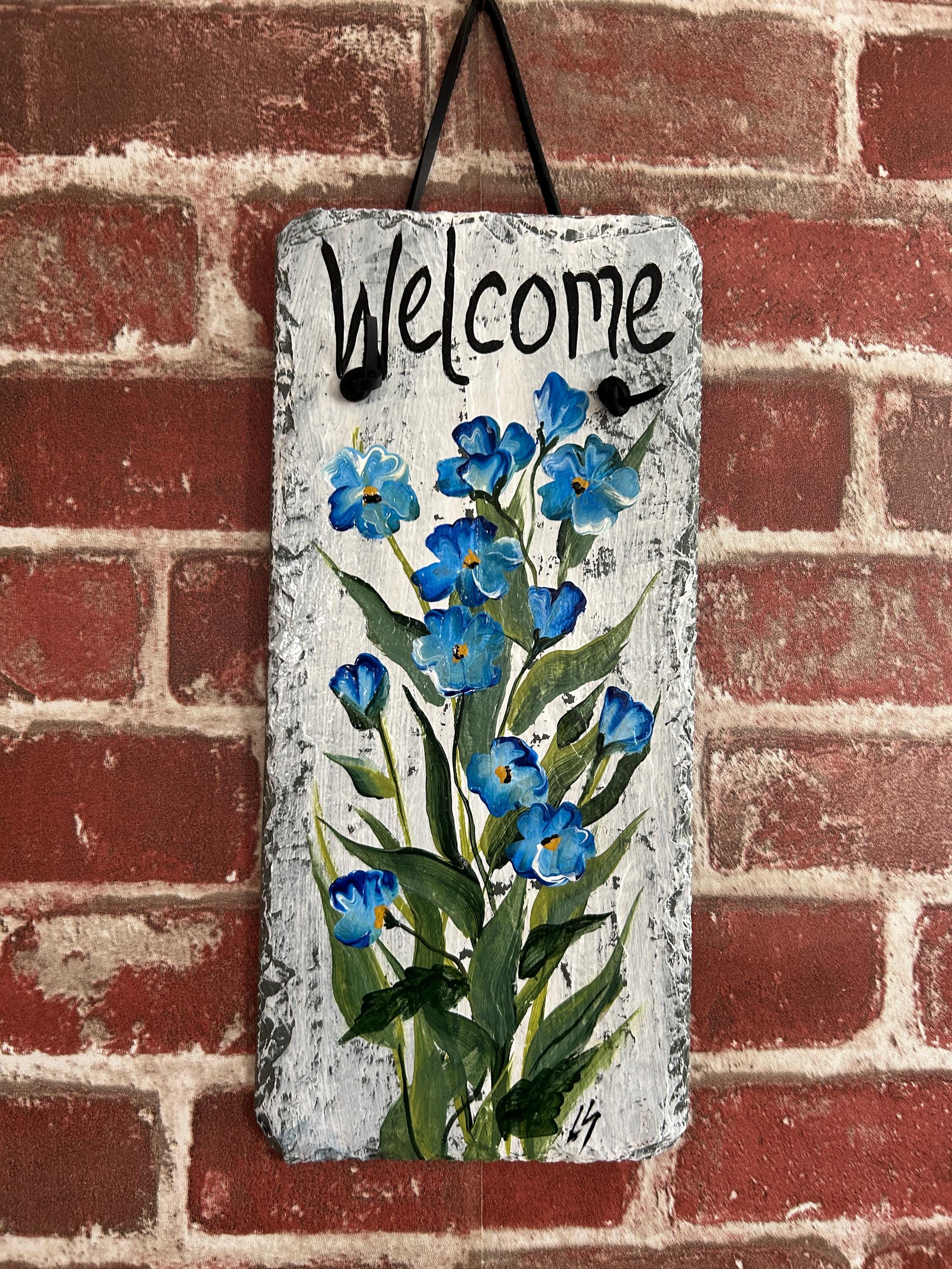 Hand-Painted Blue Floral Slate welcome Sign: Spring Porch Decor (12x5)