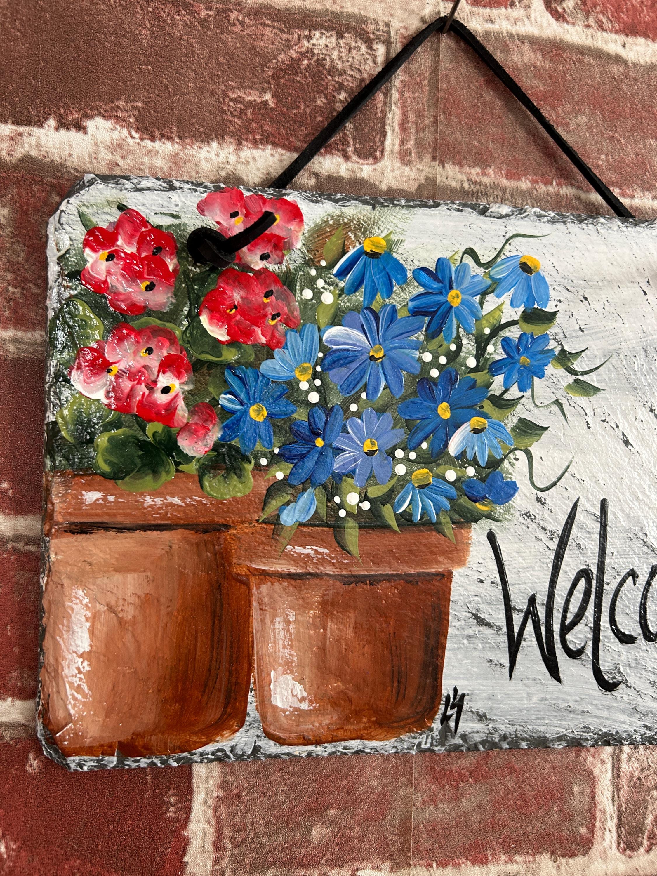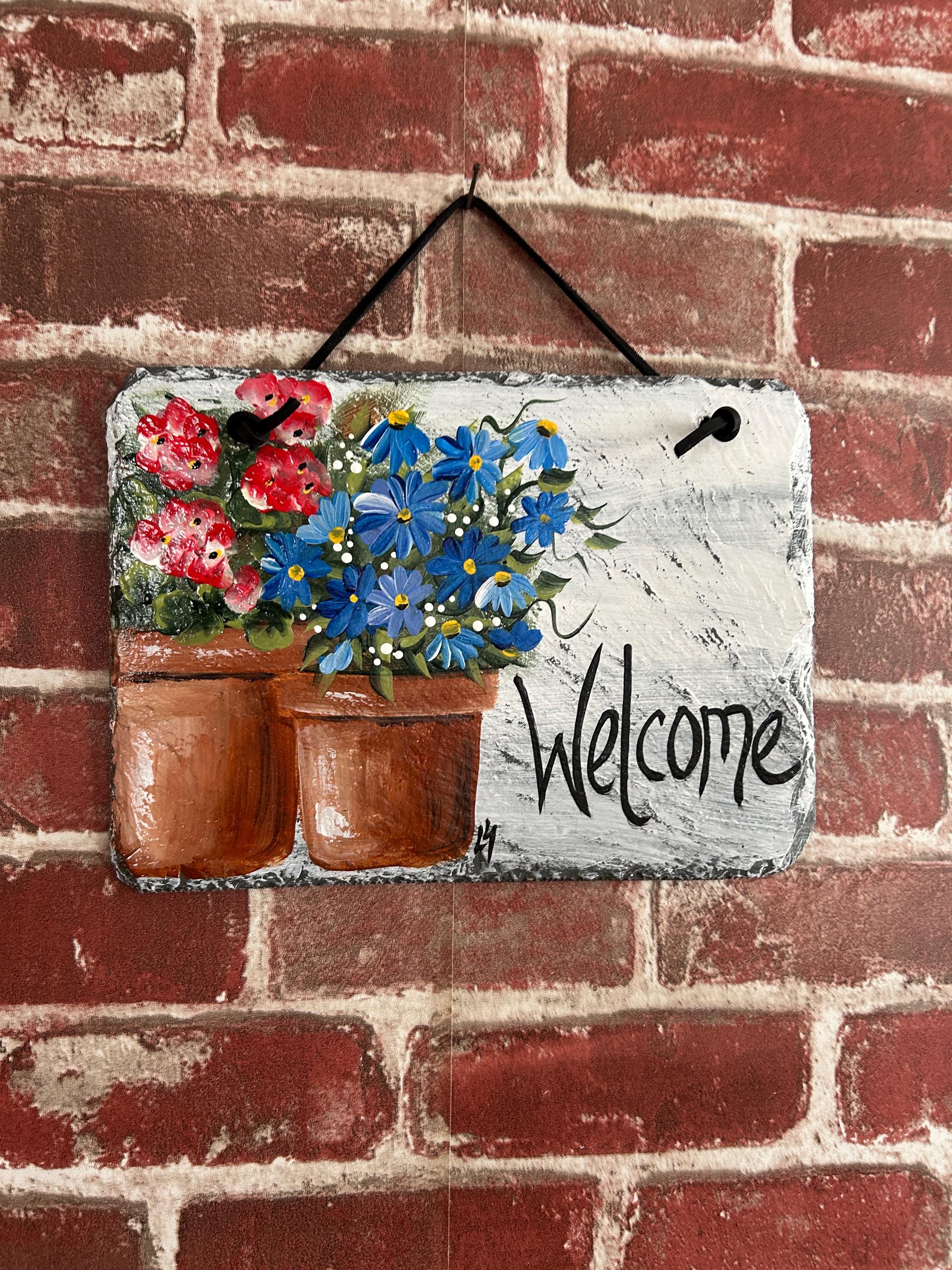 Painted slate welcome sign, 7 x 10 slate sign, welcome plaque, Porch decor, door hanger, welcome sign for apartment, small slate sign