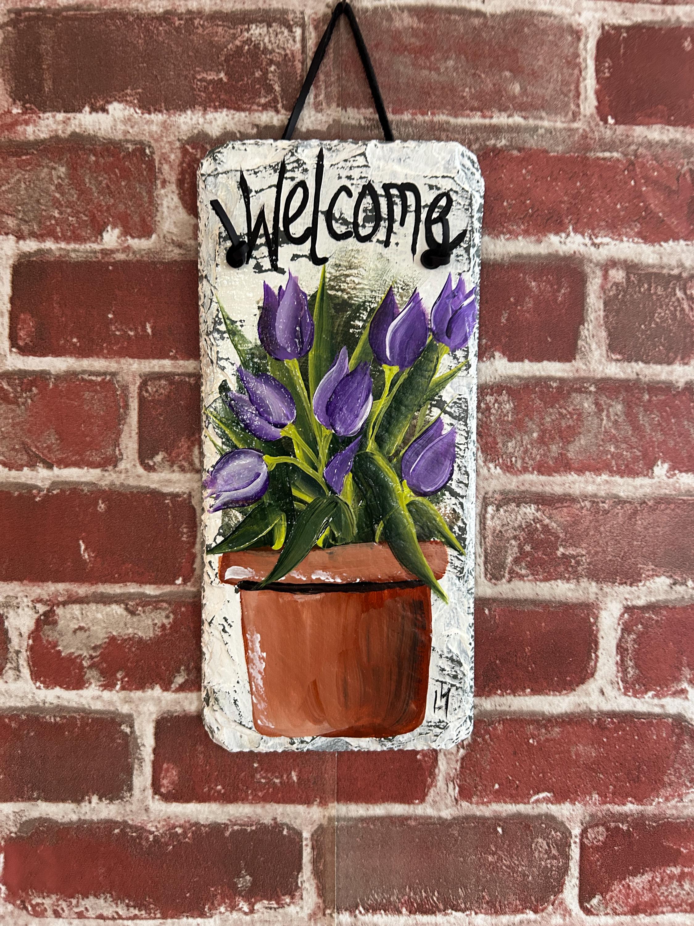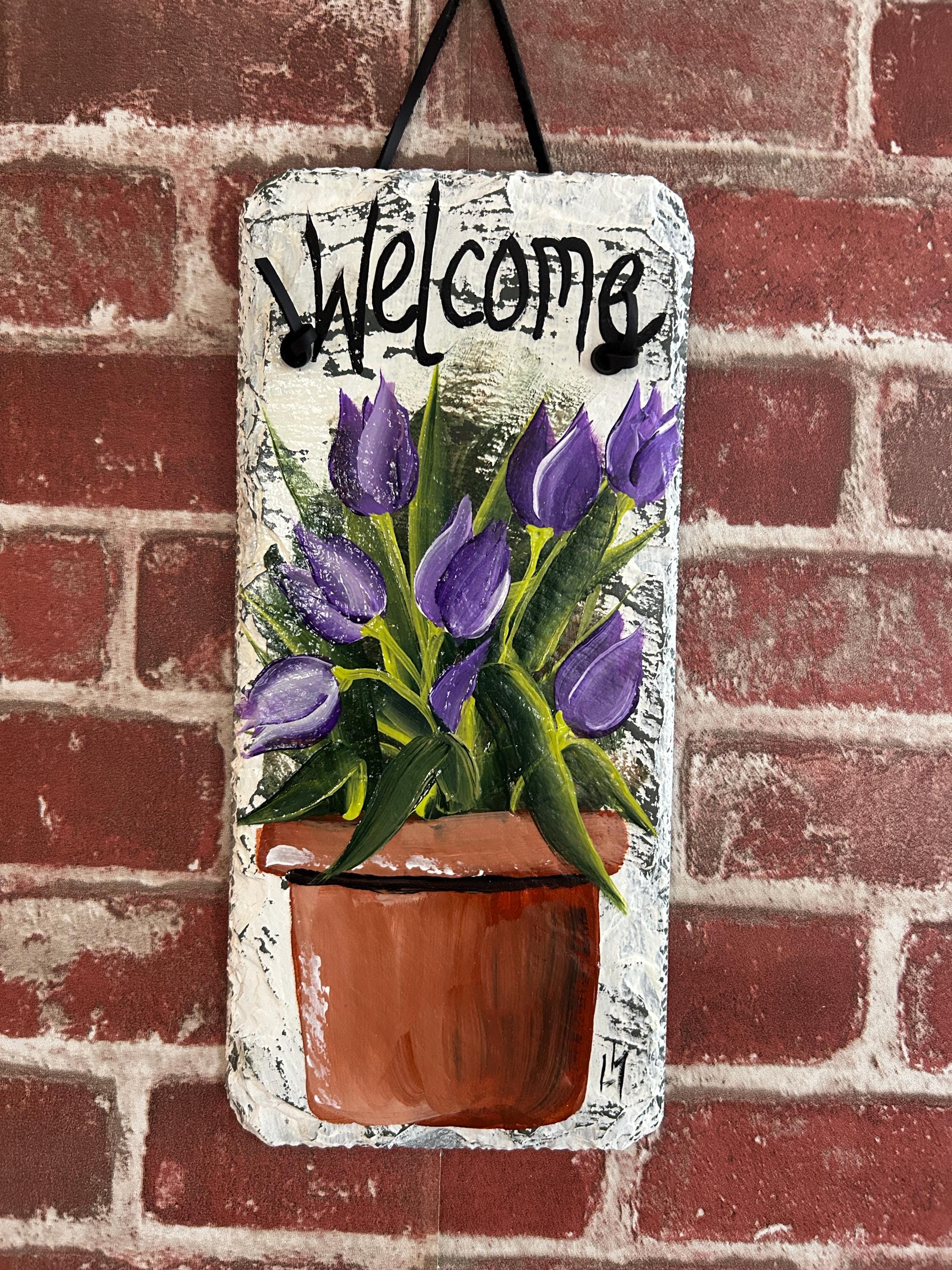 Hand-Painted Purple Tulip Slate welcome Sign: Spring Porch Decor (12x5)