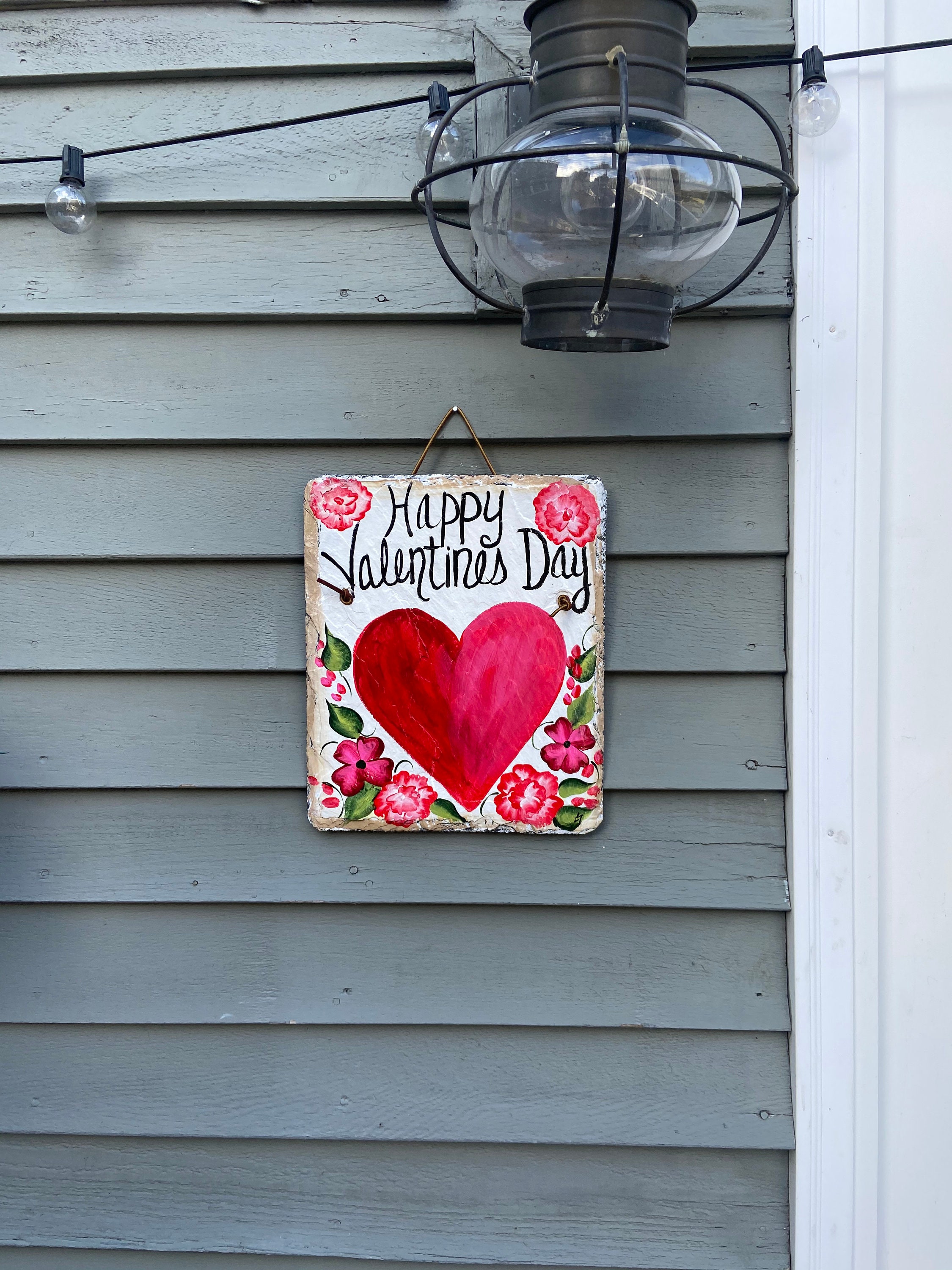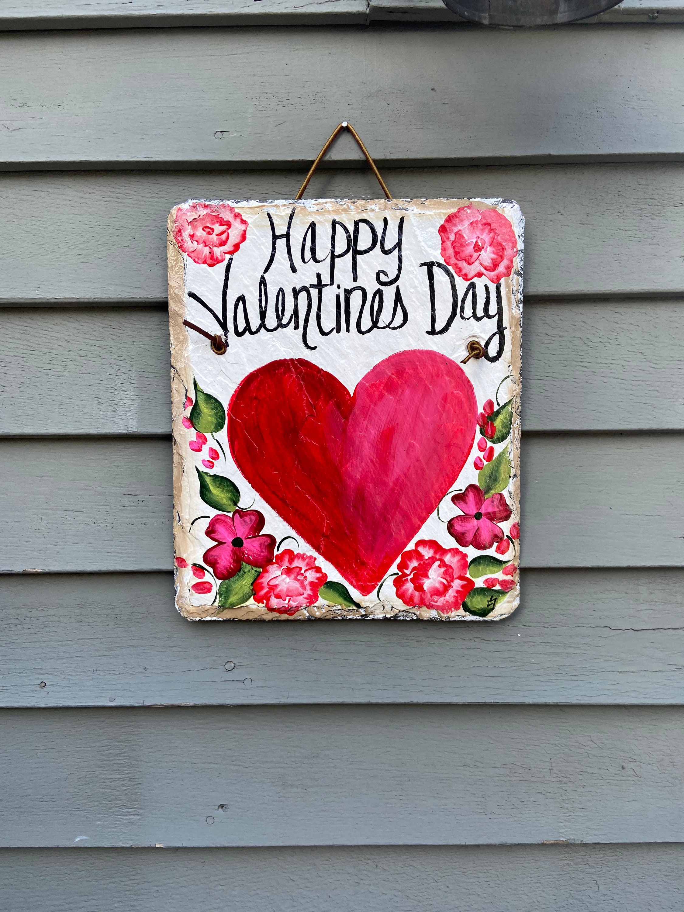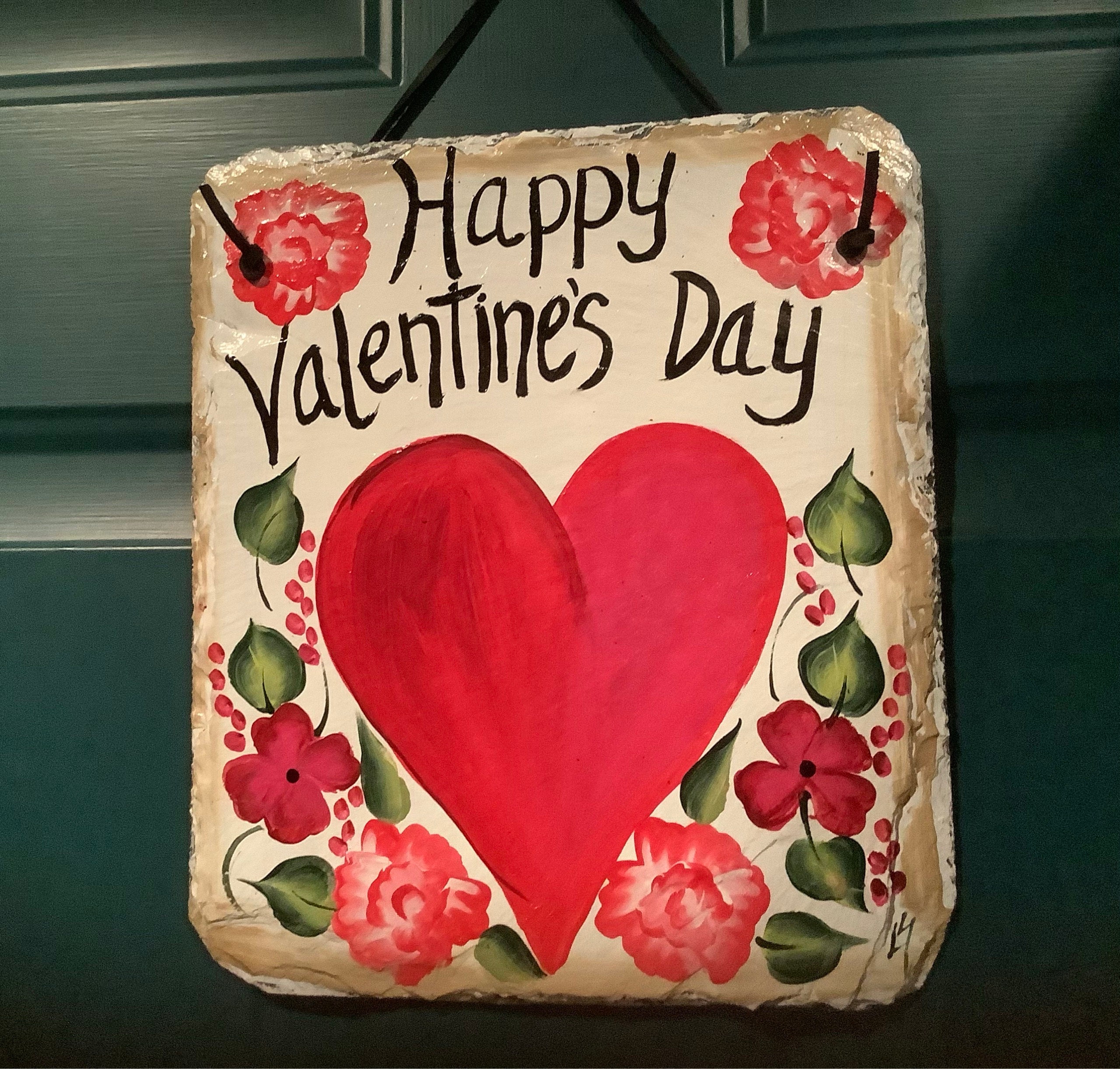 Valentine's Day Slate Heart door hanging, Front door decor, Hand painted slate plaque, 10x12 recycled roof slate, Welcome sign